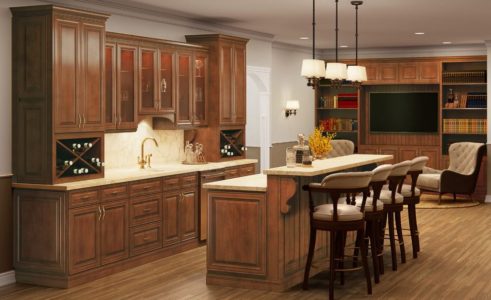- Elegant and classic mitered door cabinets rich saddle stain with glaze!